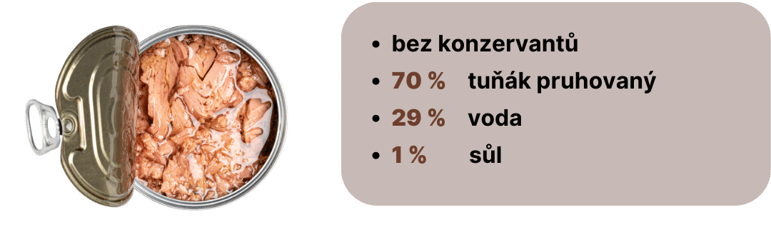 Tuňák pruhovaný (Katsuwonus pelamis) 70%, vlastní šťáva 29%, jedlá sůl.