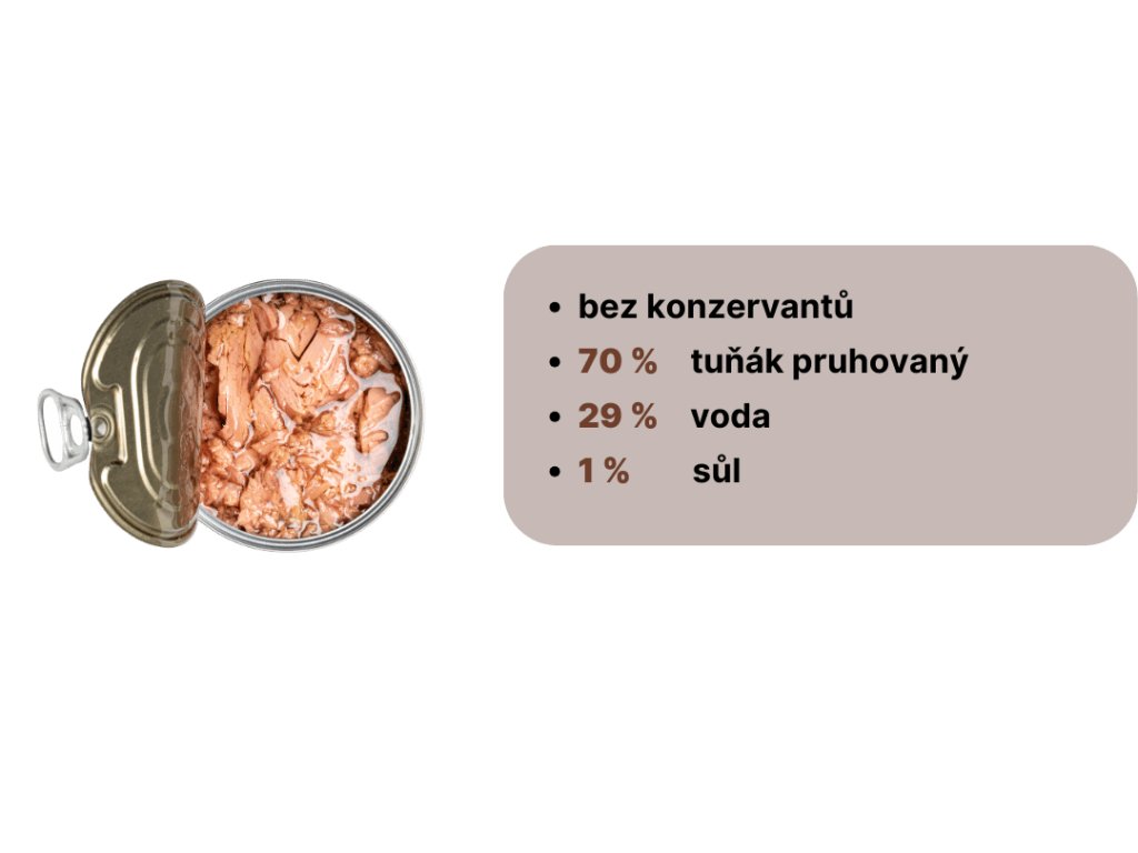 Tuňák pruhovaný (Katsuwonus pelamis) 70%, vlastní šťáva 29%, jedlá sůl.