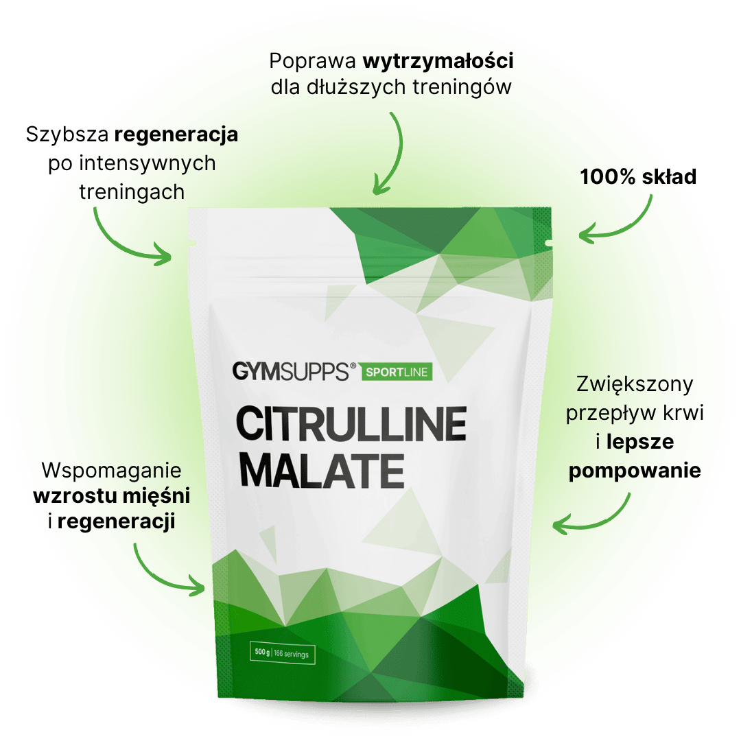 Jabłczan cytruliny to połączenie aminokwasu cytruliny i jabłczanu. Cytrulina to aminokwas naturalnie występujący w organizmie, który odgrywa ważną rolę w cyklu mocznikowym, pomagającym usuwać amoniak, toksyczną substancję powstającą podczas intensywnego treningu. Jabłczan wspomaga produkcję energii w mitochondriach, czyli małych elektrowniach naszych komórek.